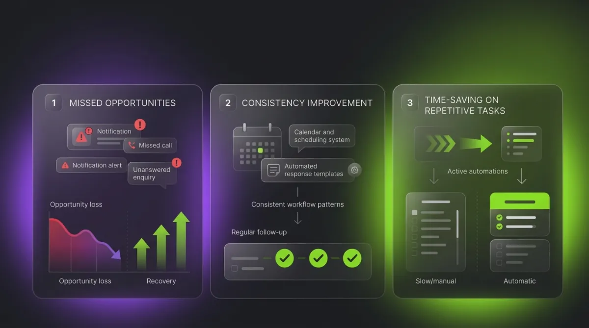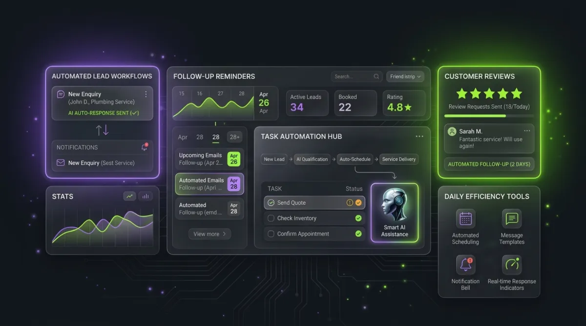 Once a business has a stronger website in place, the next bottleneck is usually time, consistency, and follow-up. AI systems help close those gaps by supporting the parts of the business that often slow down growth, from missed enquiries to delayed replies and weak review collection.